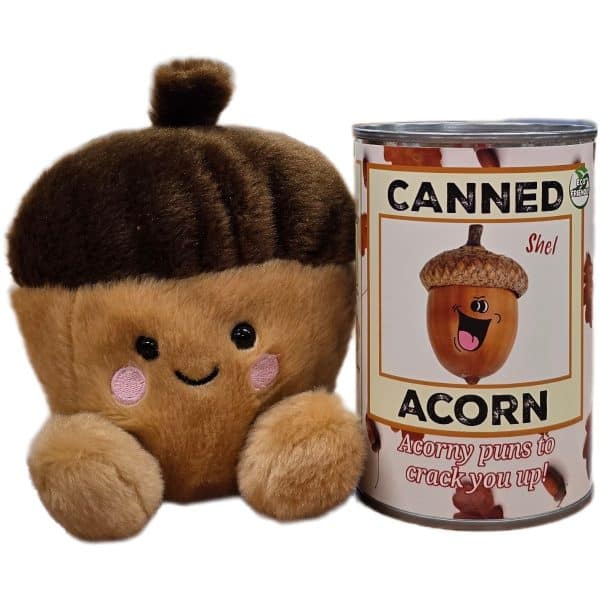 • Acorn plush sealed in a can. Use a can opener to open the fun gift or choose the pop top lid!