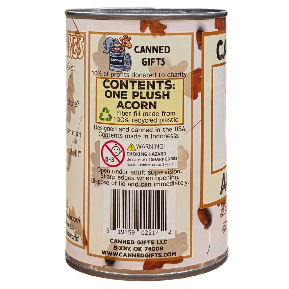 • Acorn plush sealed in a can. Use a can opener to open the fun gift or choose the pop top lid!