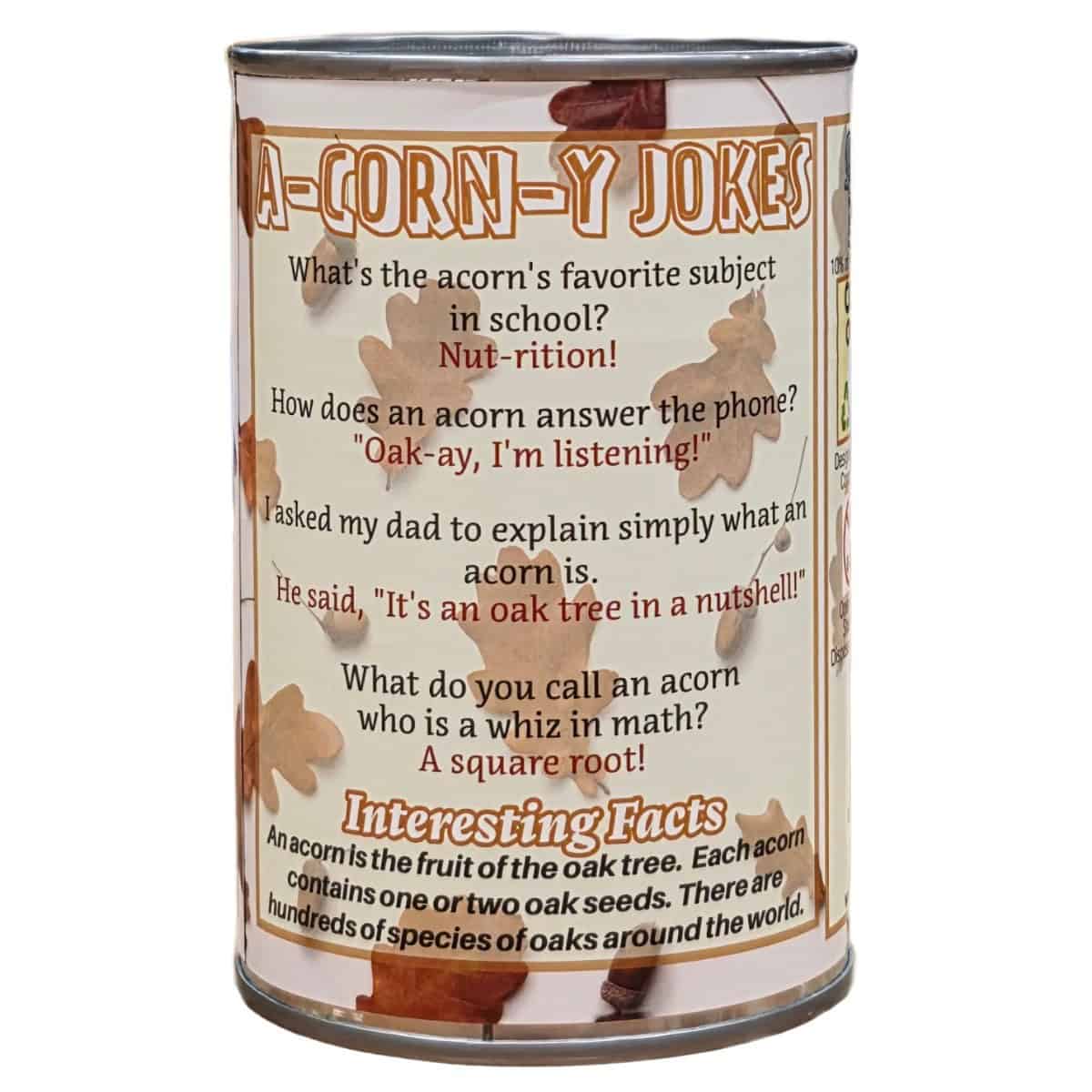 • Funny acorn jokes and an interesting fact on the can.