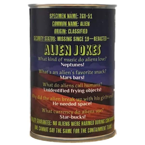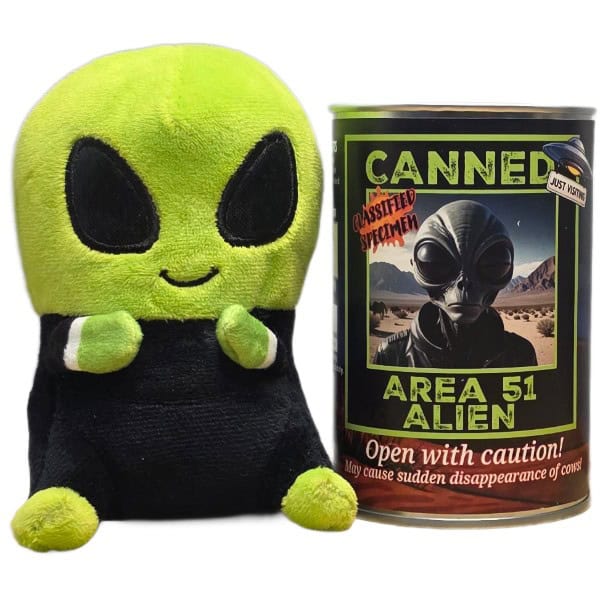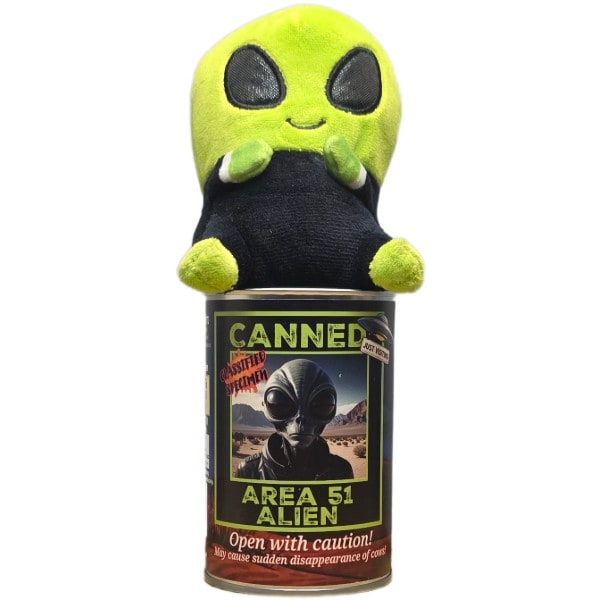 • Alien plush sealed in a can. Choose your lid: regular, pop top, or foil.