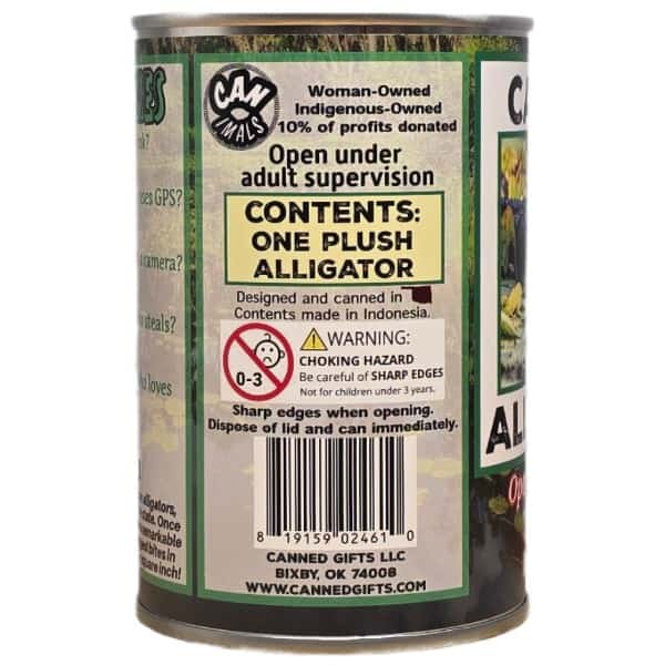 • Alligator plush sealed in a can. Use a can opener to open the fun gift or choose the pop top lid!