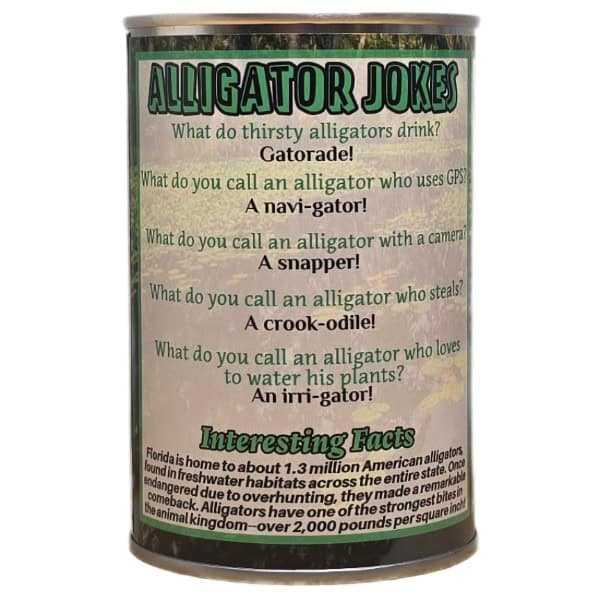 • Funny alligator jokes and an interesting fact on the can.