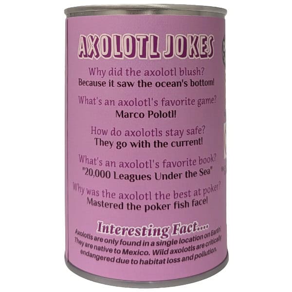 Funny axolotl jokes and an interesting fact on the can.
