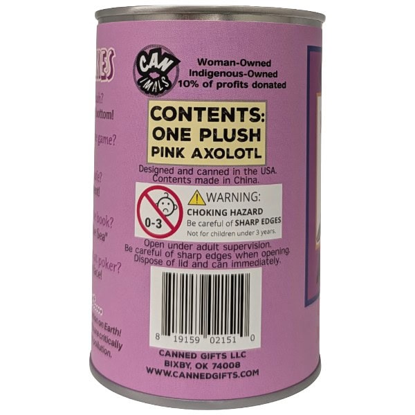 Included is 1 plush pink axolotl sealed in a can. Use a can opener to open the fun gift or choose a pop top lid!