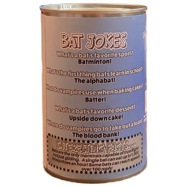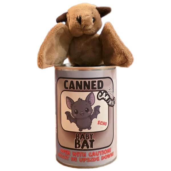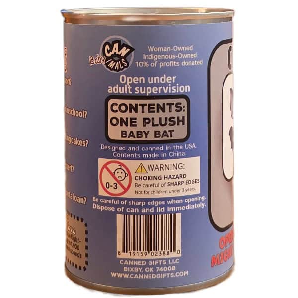 Included is 1 plush baby bat sealed in a can. Your choice of lid style: regular (open with a can opener), pop top, or foil!