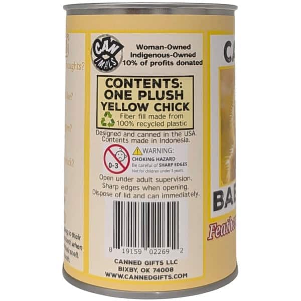 • Chick plush sealed in a can. Your choice of lid style: pop top, standard, or foil.