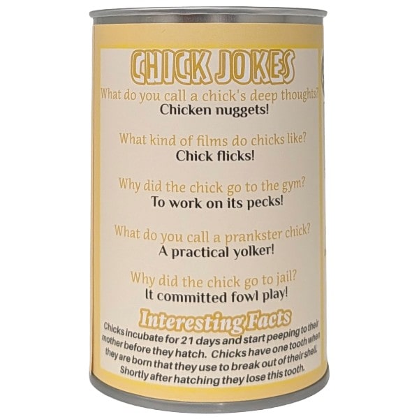 • Funny chick jokes and an interesting fact on the can.