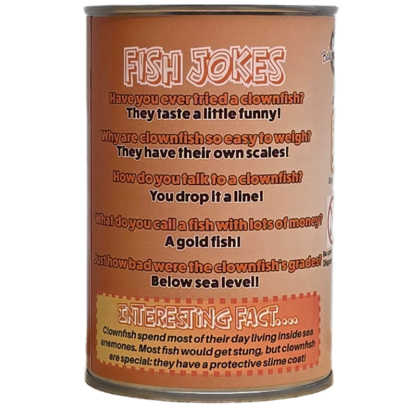 Funny clownfish jokes and interesting facts on the can.