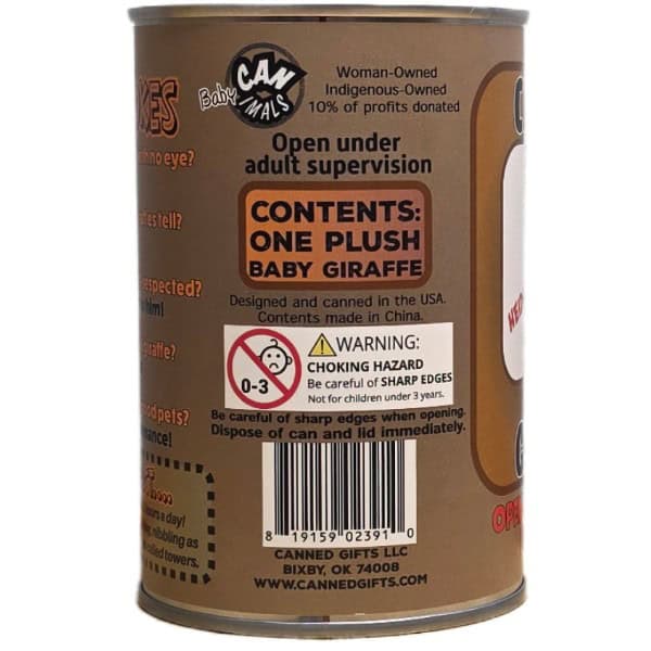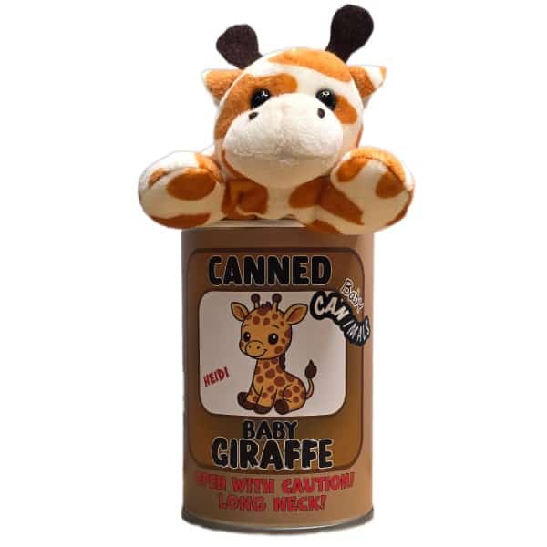 Included is 1 plush baby giraffe sealed in a can. Your choice of lid style: regular (open with a can opener), pop top, or foil.