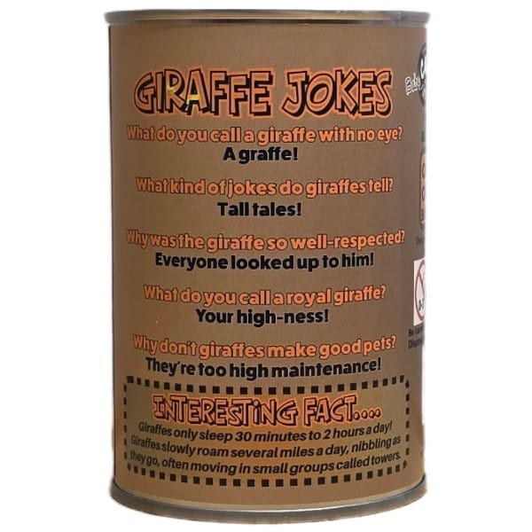 Funny giraffe jokes and interesting facts on the can.