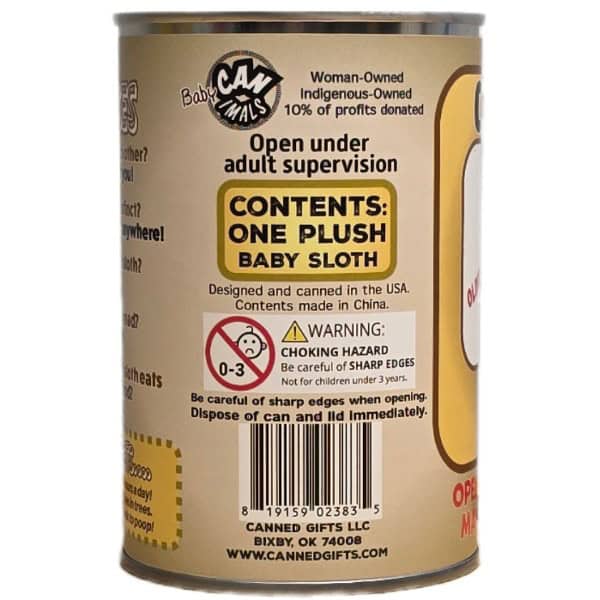 Included is 1 plush baby sloth sealed in a can. Your choice of lid style: regular (open with a can opener), pop top, or foil.