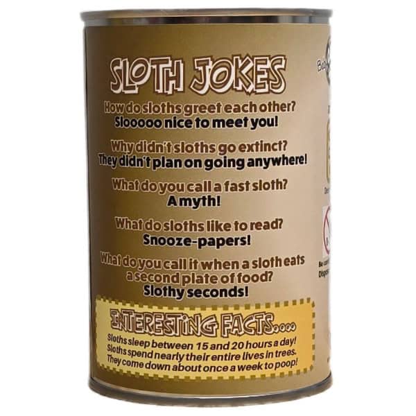 Funny sloth jokes and interesting facts on the can.