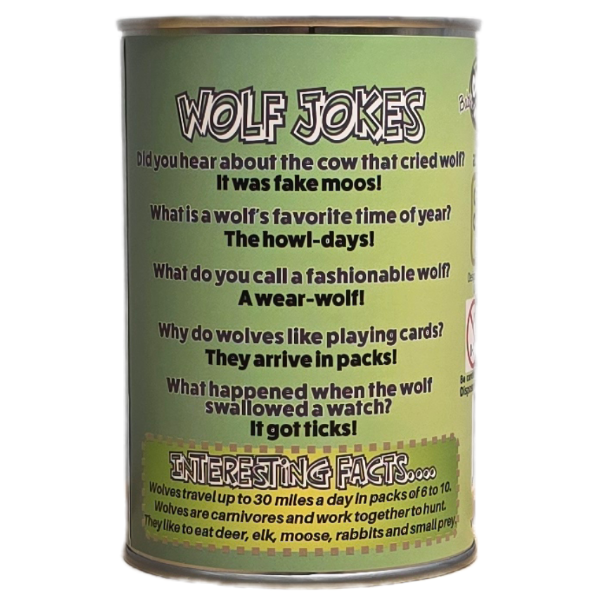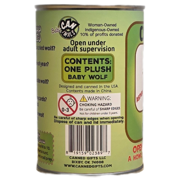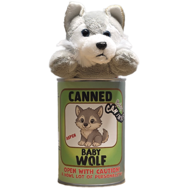 Included is 1 plush baby wolf sealed in a can. Use a can opener to open the fun gift or choose a pop top lid!