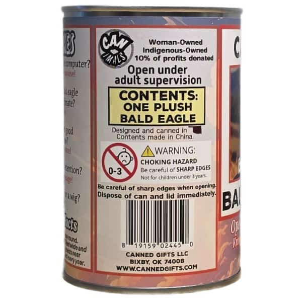 • Plush bald eagle sealed in a can. Your choice of lid style: regular, pop top, or foil.
