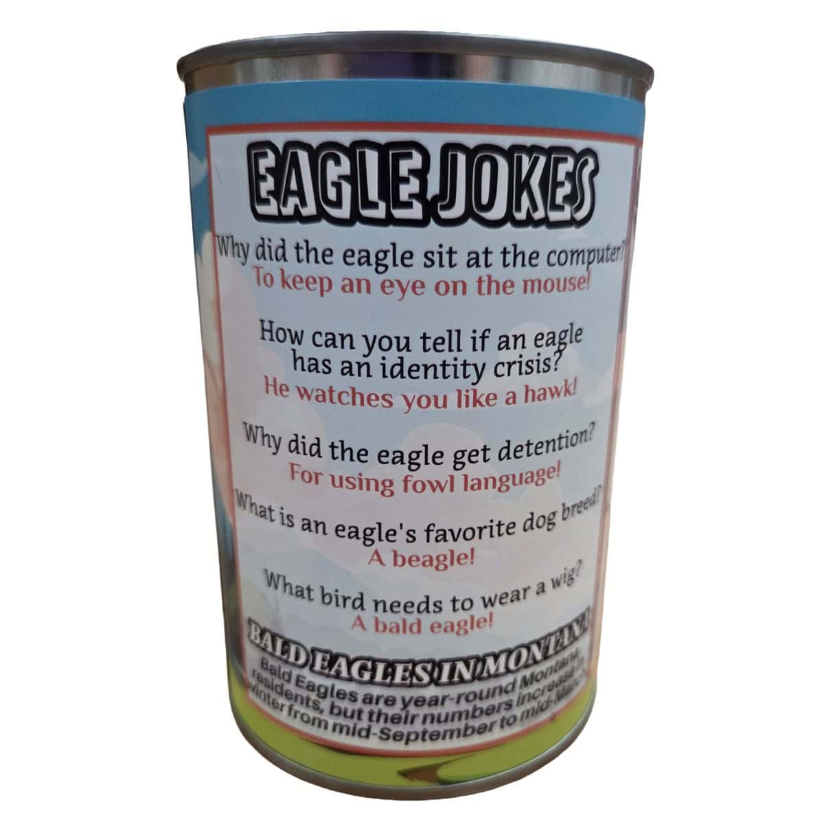 • Funny eagle jokes and interesting facts about Montana Bald Eagles on the can.