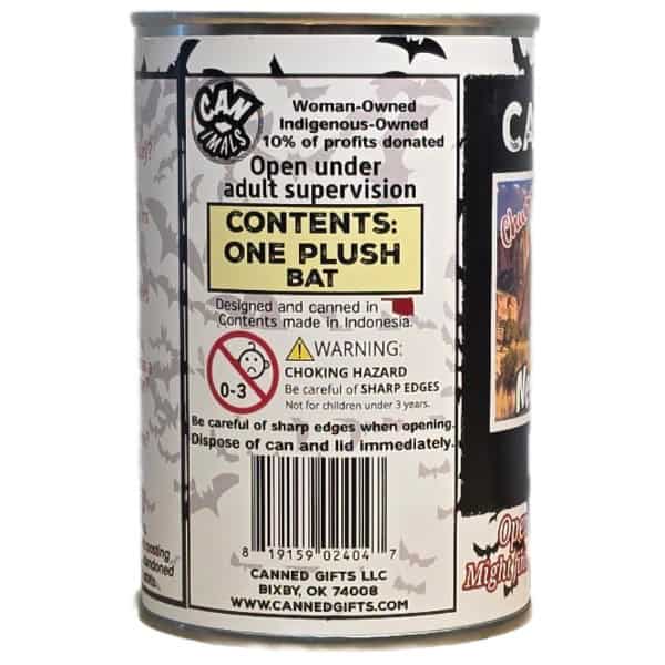 • Bat plush sealed in a can. Choose your lid style: standard, pop, or foil.
