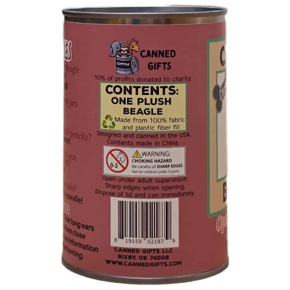• Beagle plush sealed in a can. Use a can opener to open the fun gift or choose the pop top lid!