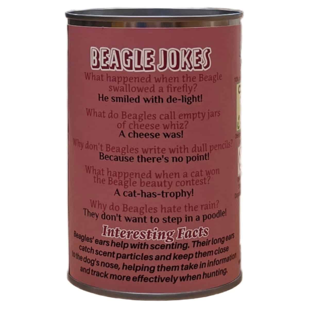 • Funny Beagle jokes and an interesting fact on the can.