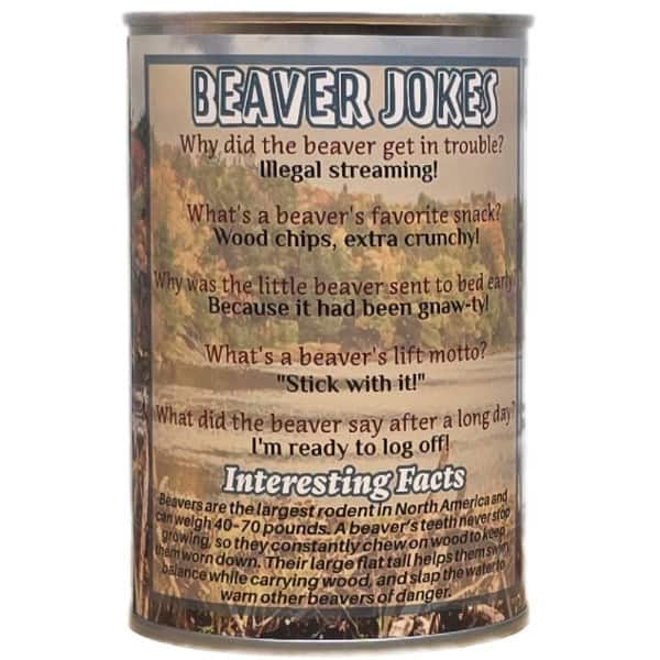 • Funny beaver jokes and interesting facts on the can.