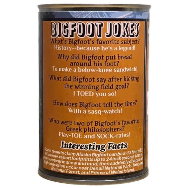 • Funny bigfoot jokes and interesting facts about the Idaho Bigfoot on the can.