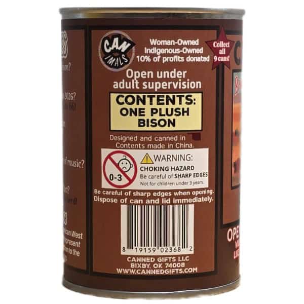 • Bison plush sealed in a can. Your choice of lid style: regular (open with a can opener), pop top, or foil lid.