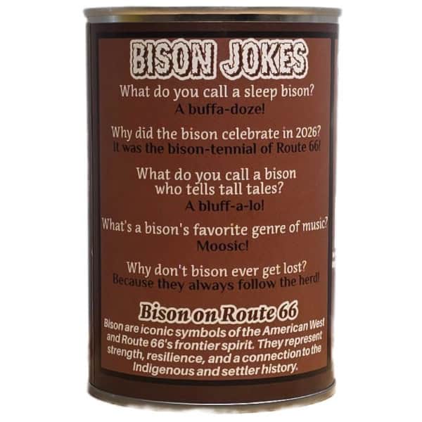 • Funny bison jokes and an interesting fact about Bison Along Route 66 on the can.