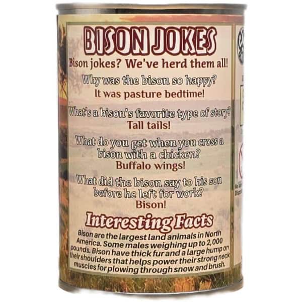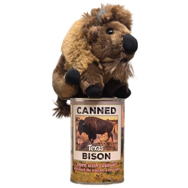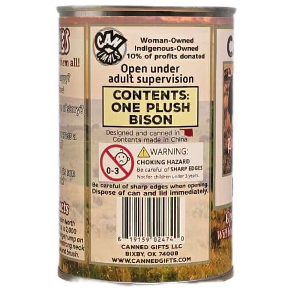 • Bison plush sealed in a can. Your choice of lid style: regular (which requires a can opener), pop top, or foil.