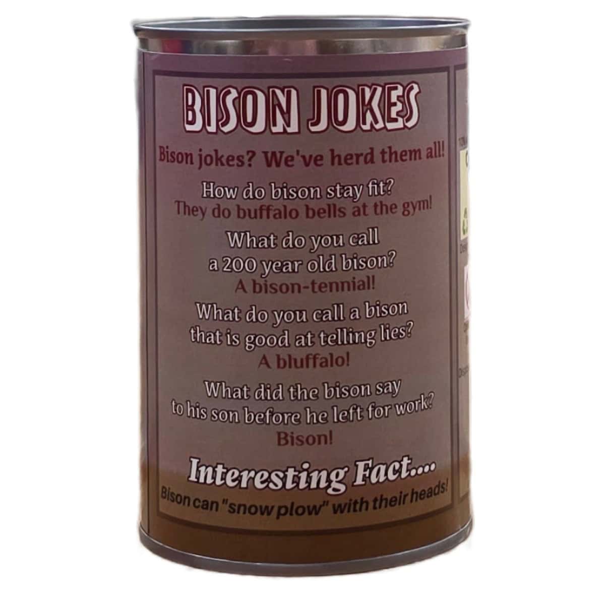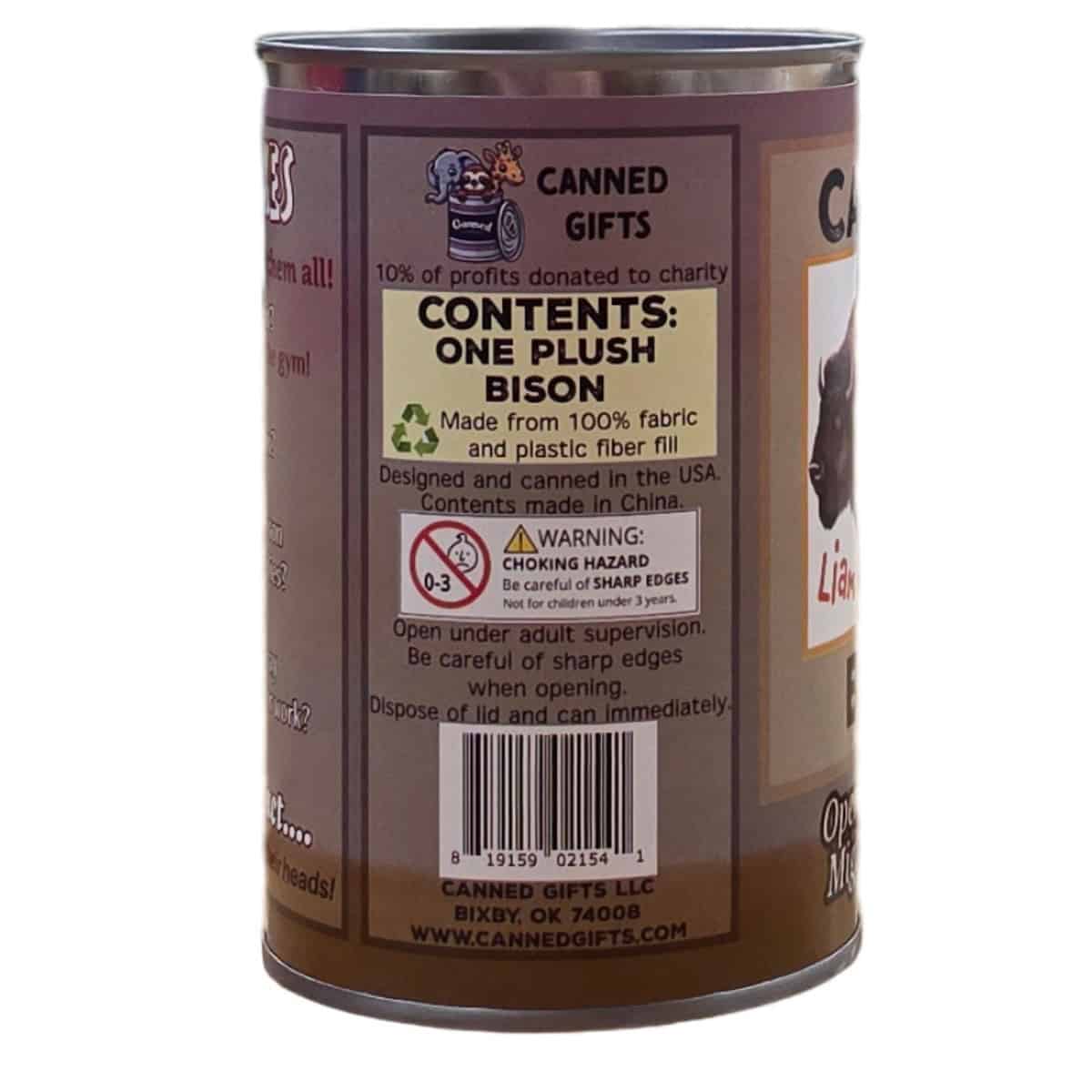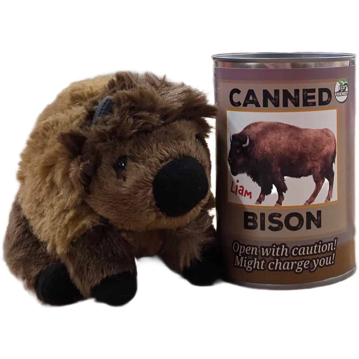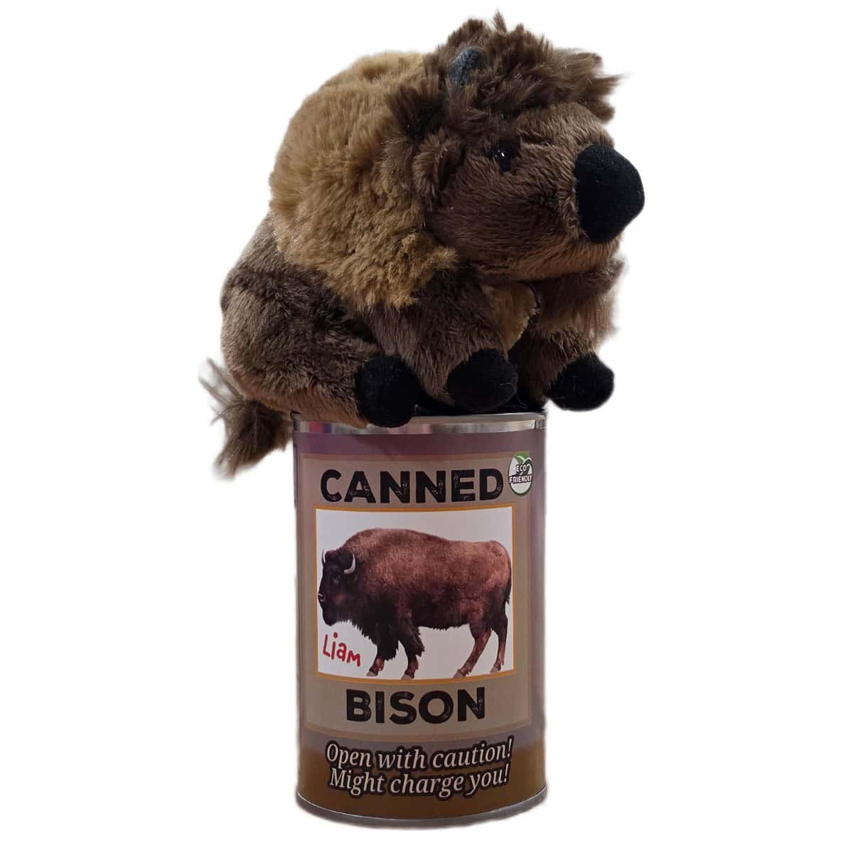 • Bison plush sealed in a can. Your choice of lid style: regular (which requires a can opener), pop top, or foil.