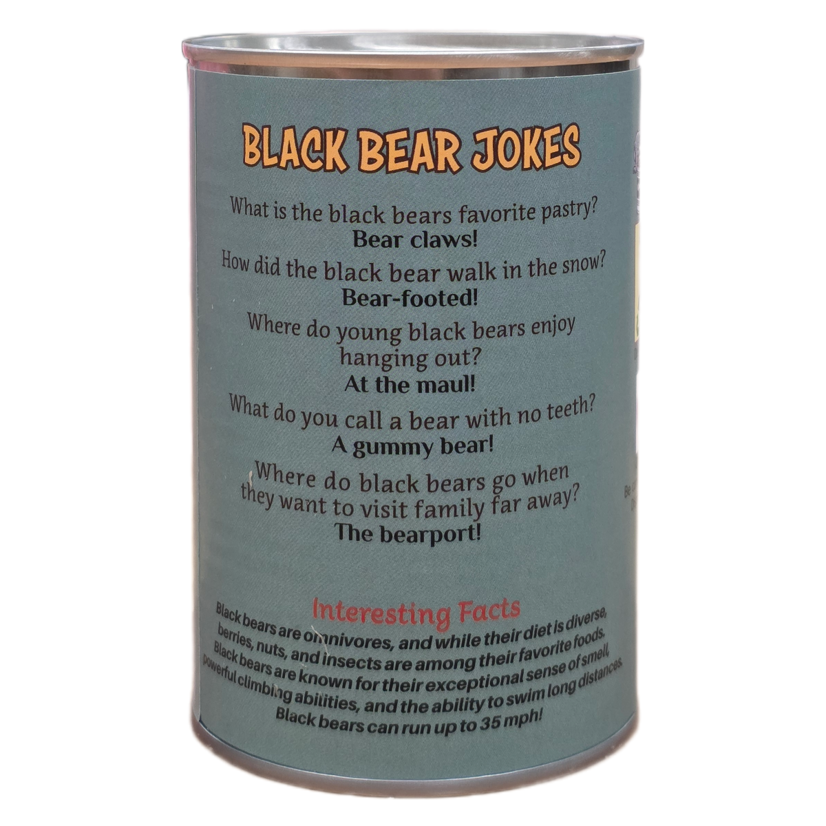 • Black Bear plush sealed in a can. Your choice of lid style: standard, pop top, or foil.