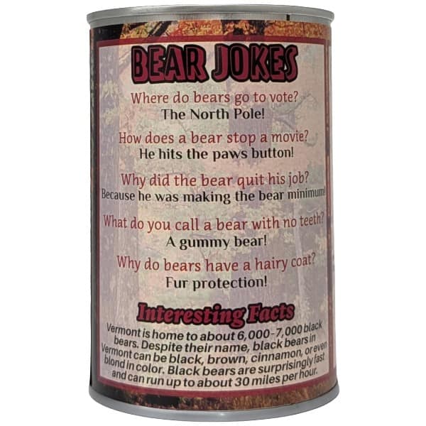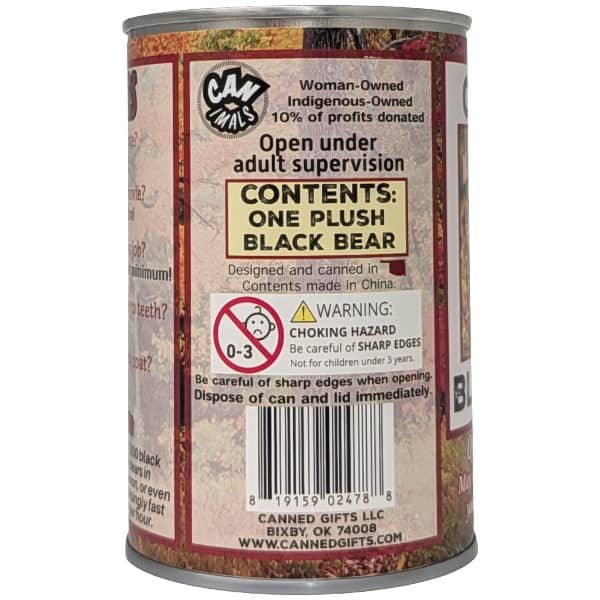 • Black bear plush sealed in a can. Your choice of lid style: regular (which requires a can opener), pop top, or foil.
