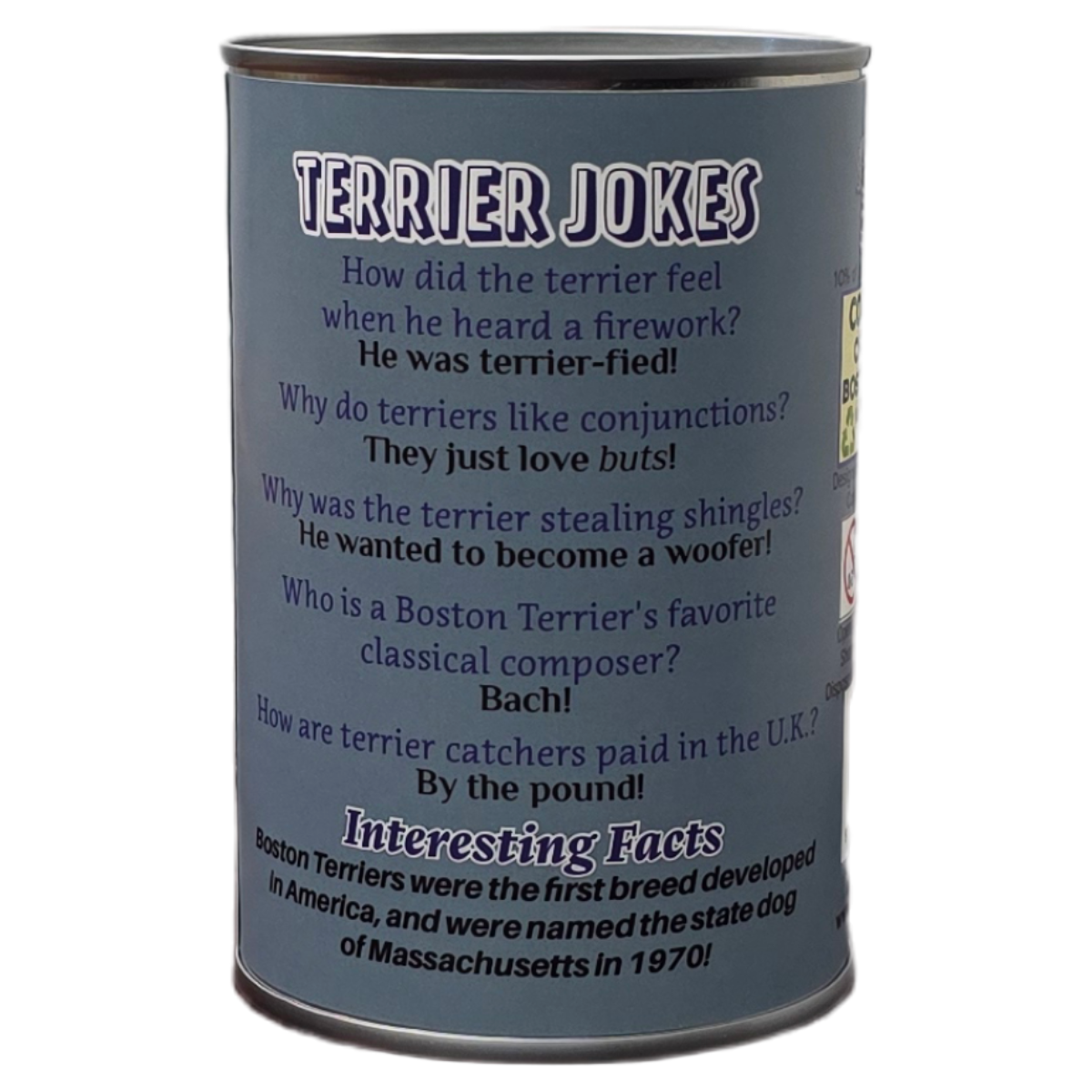 • Boston Terrier plush sealed in a can. Use a can opener to open the fun gift or choose the pop top lid!
