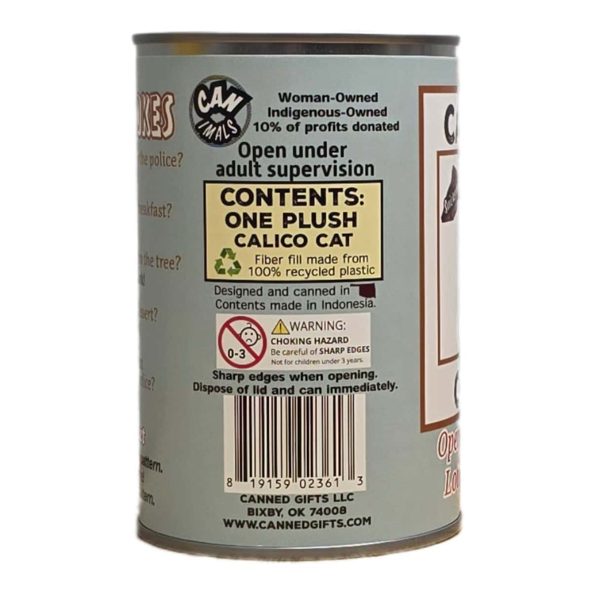 Included is 1 plush calico cat sealed in a can. Use a can opener to open the fun gift or choose a pop top lid