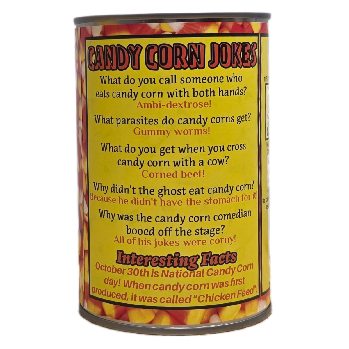 • Funny candy corn jokes on the can.