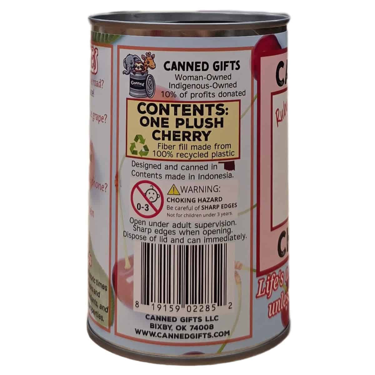 • Cherry plush sealed in a can. Choose your lid style: standard, pop top, or foil.