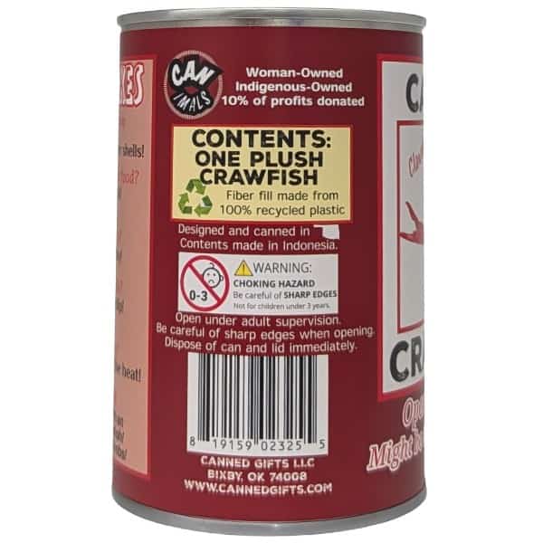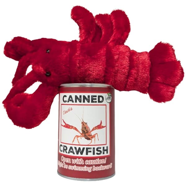 • Crawfish plush sealed in a can. Your choice of lid style: pop top, standard, or foil.