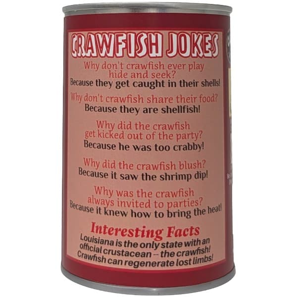 • Funny crawfish jokes and an interesting fact on the can.