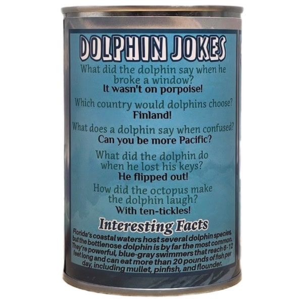 • Funny dolphin jokes and an interesting fact on the can.