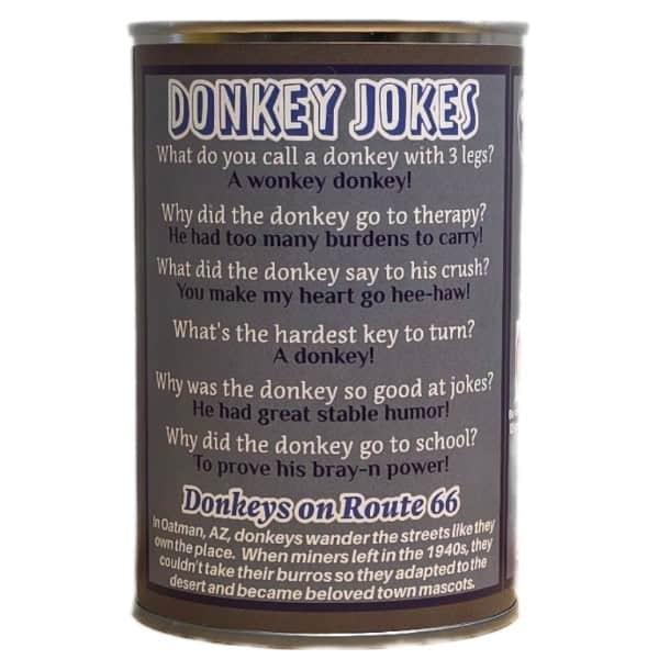 • Funny donkey jokes and an interesting fact about Donkeys Along Route 66 on the can.