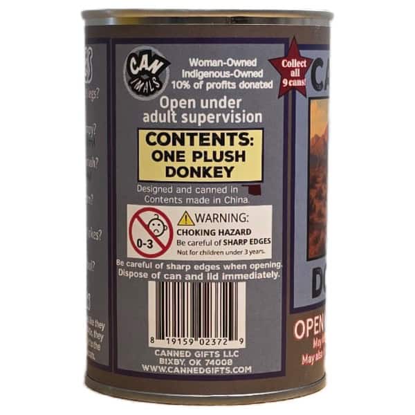 • Donkey plush sealed in a can. Your choice of lid style: regular (open with a can opener), pop top, or foil lid!
