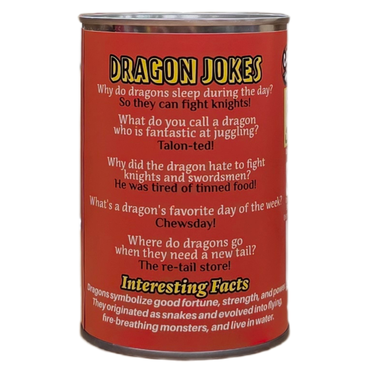 • Funny dragon jokes and interesting facts on the can.