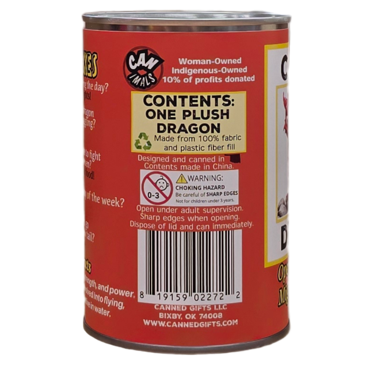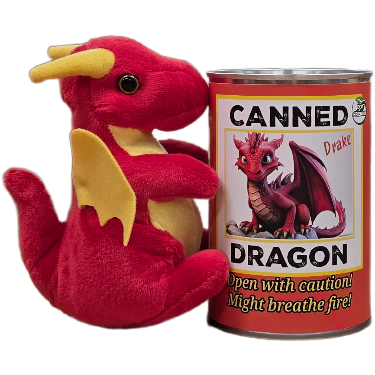 • Dragon plush sealed in a can. Use a can opener to open the fun gift or choose the pop top lid!