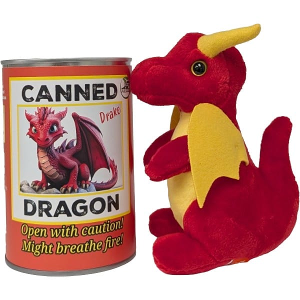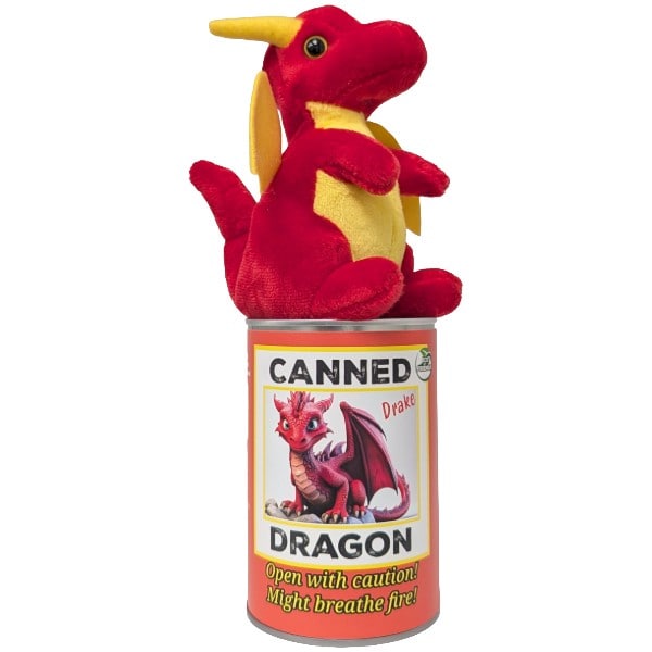 • Dragon plush sealed in a can. Your choice of lid style: pop top, foil, or standard lid (open with a can opener).