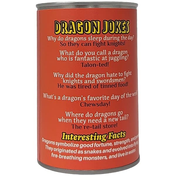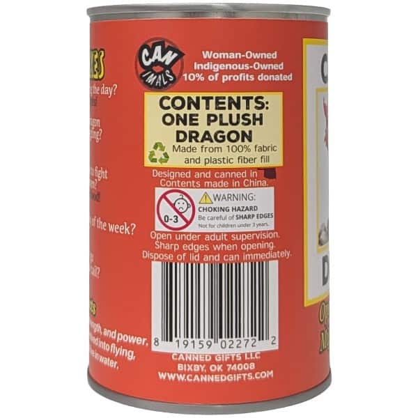 • Dragon plush sealed in a can. Use a can opener to open the fun gift or choose the pop top lid!