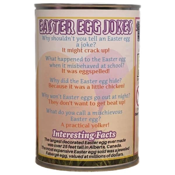 • Funny Easter Egg jokes and an interesting fact on the can.