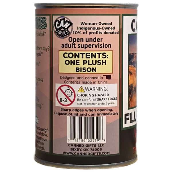 • Bison plush sealed in a can. Use a can opener to open the fun gift or choose the pop top lid!