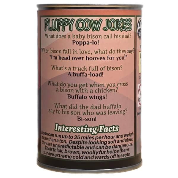 • Funny bison jokes and an interesting fact on the can.