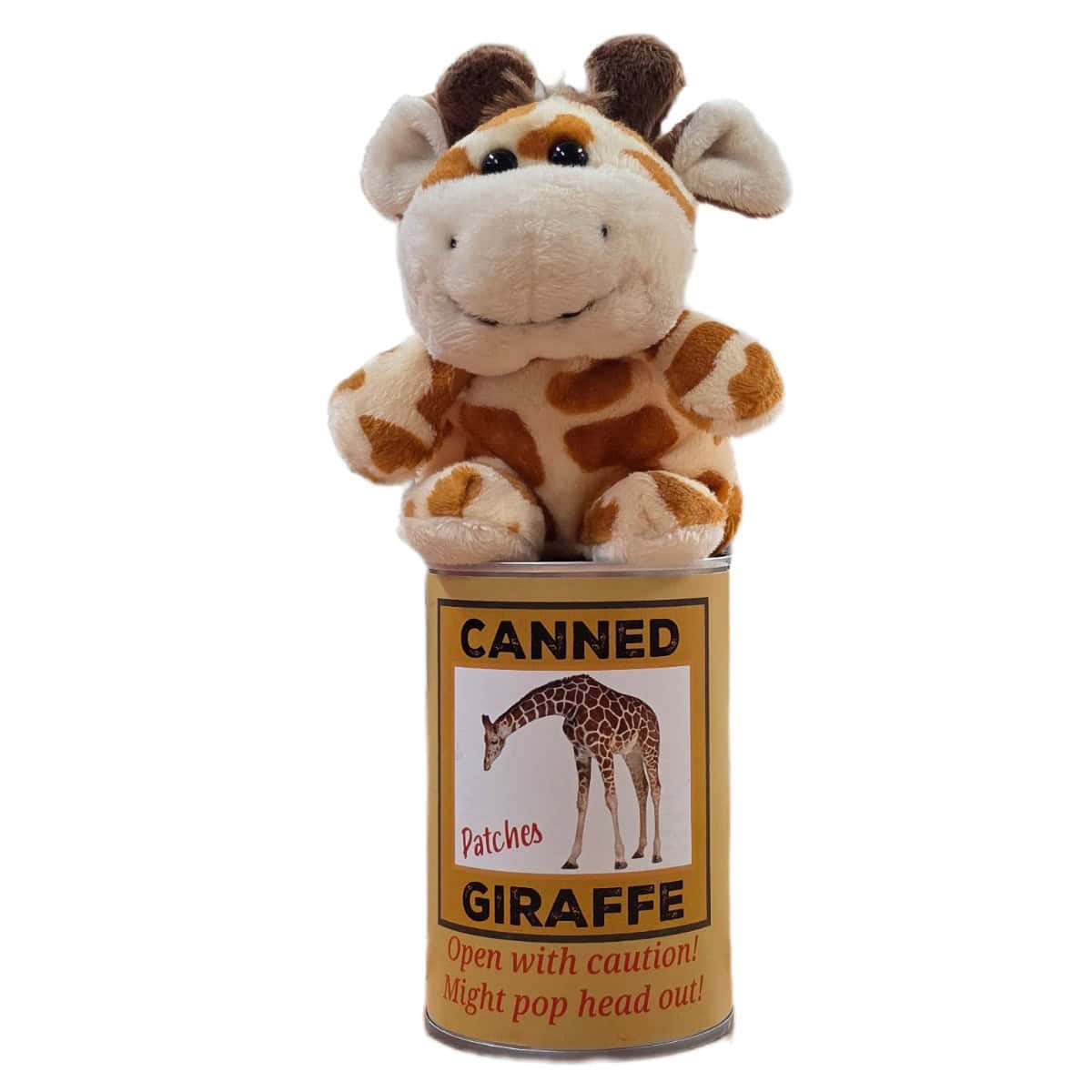 • Plush Giraffe sealed in a can. Use a can opener to open the fun gift or choose a pop top lid!