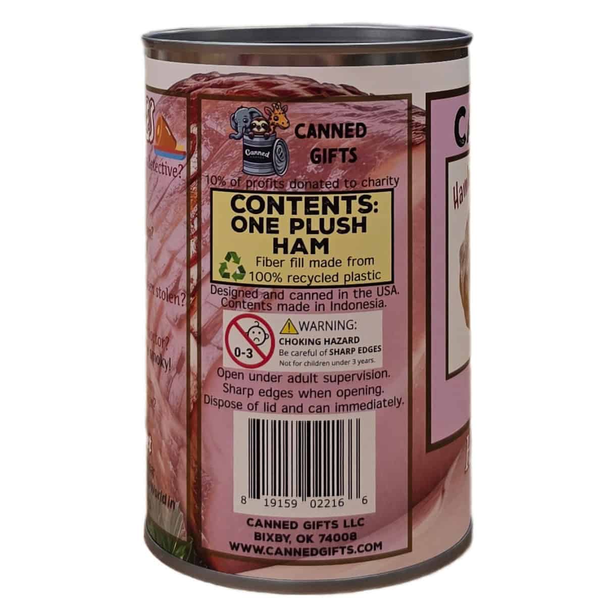 • Ham plush sealed in a can. Use a can opener to open the fun gift or choose the pop top lid!
