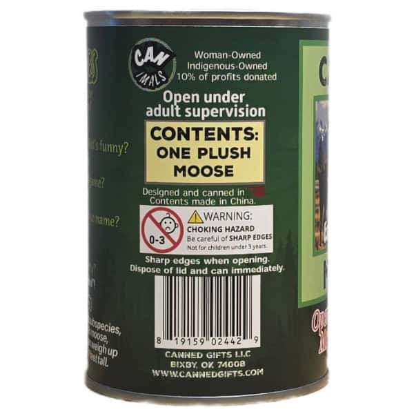• Plush moose sealed in a can. Your choice of lid style: regular, pop top, or foil.
