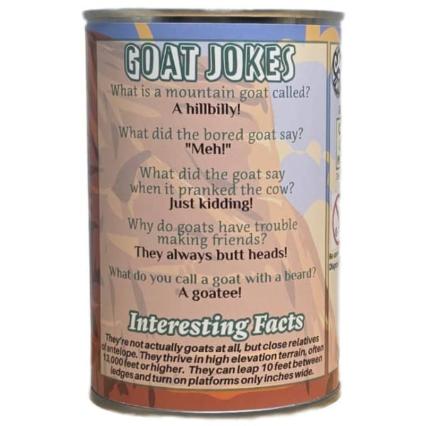 • Funny goat jokes and interesting facts about Idaho Mountain Goats on the can.
